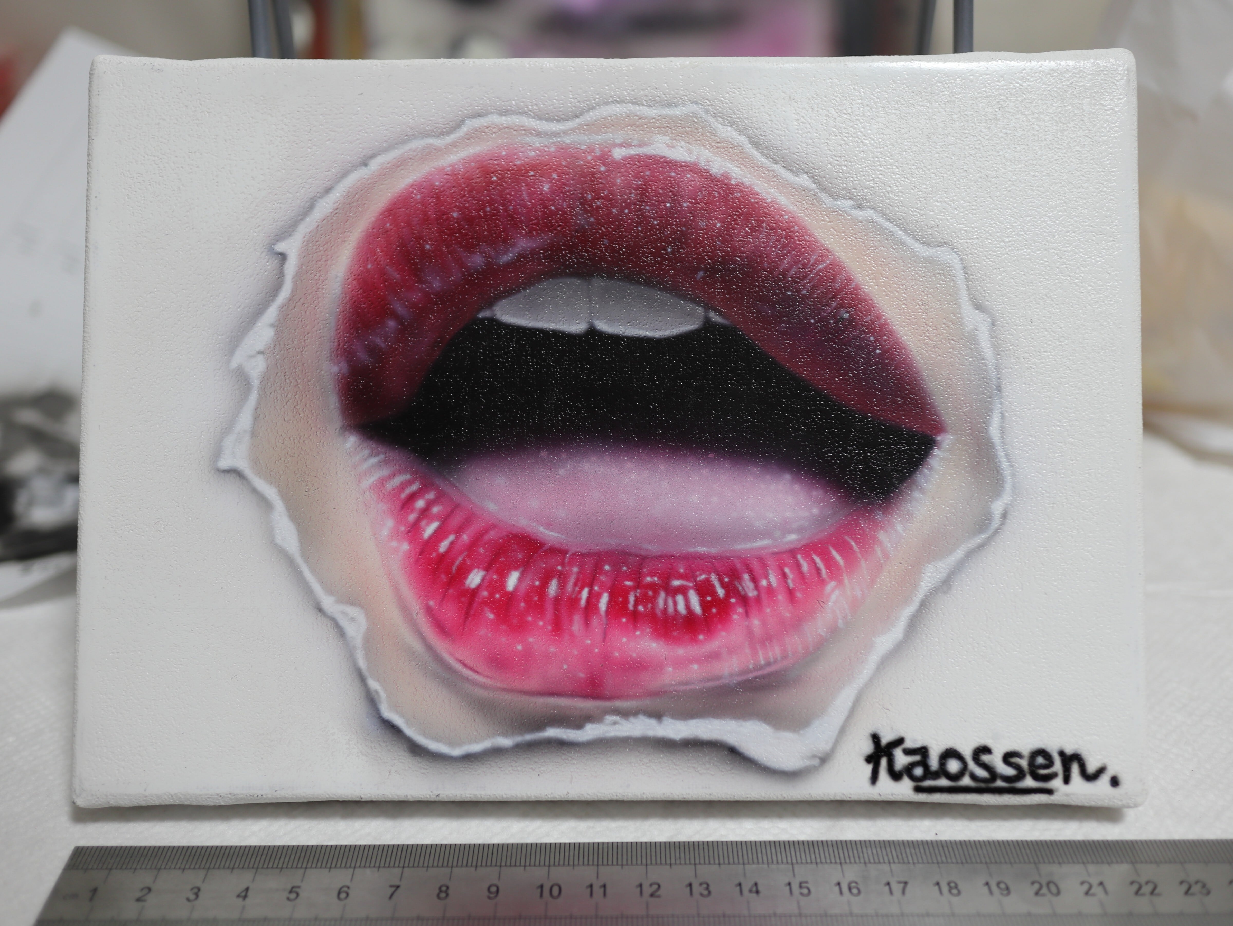 雑誌から無造作に切り取られたような「唇」のモチーフは、前後の文脈を失い、意図せず消費されていく言葉の脆さを表現しています。真意がどこにあるのか見失われがちな情報社会における、コミュニケーションのあり方を問いかける一枚です。