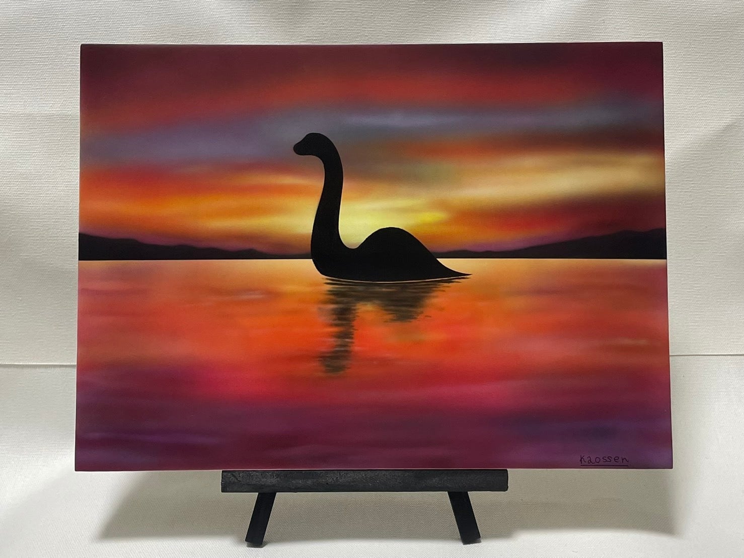 夕日が湖面を染め上げる静寂の中、水面から姿を現す巨大な影。スコットランドの古い伝説に語り継がれる神秘の生き物・ネッシーを、幻想的な夕景とともに描いた一点もの作品です。